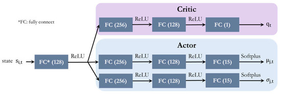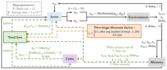 where B is the batch size; is the advantage value of taking action at state , which can be estimated using Equation (6); is the Q value representing the expected future rewards of taking action at state , which can be calculated based on the reward , discount factor , and the next state value, as shown in Equation (7); is the state value of state ; and γ is the discount factor, which is between zero and one. The closer the discount factor is to one, the more time steps of future rewards that are considered. It should be noted that the advantage value can be calculated using the state value, reward, and discount factor, indicating that only one network must be trained to estimate the state value, which is called the critic network. represents the probability of taking action at state outputted by the actor. Therefore, the actor loss can be expressed as: