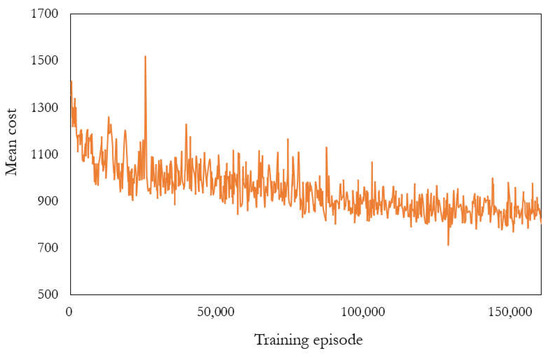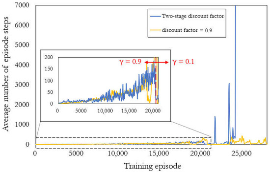The results of training are discussed in terms of the average number of steps (Figure 4 and Figure 5) and mean cost (Figure 6 and Figure 7). Each point in Figure 4, Figure 5, Figure 6 and Figure 7 represents the result of averaging over the previous 100 episodes. The training of the model with a discount factor of 0.1 is slower than that of the other two models obviously, resulting in much larger training episodes, making it difficult to present those results together with others. Therefore, the results of the model with a discount factor of 0.1 are presented separately from the other two models in Figure 5 and Figure 7.