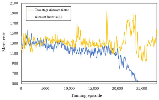 Mean costs for the last 100 training episodes for the two-stage discount factor (blue) and discount factor = 0.9 (yellow).