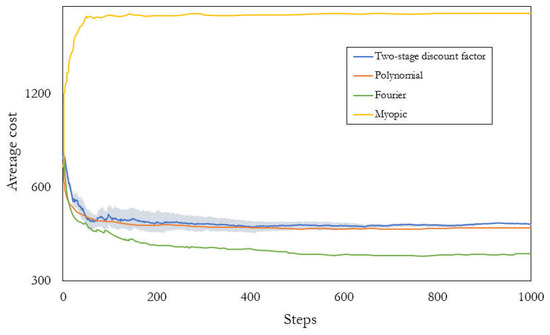 Second, we tested the two-stage discount factor model over 10 simulations with 1000 steps per episode and averaged the results over previous steps. Because the other two models were unable to provide actions for 1000 steps continuously, this test was only applicable to the two-stage discount factor model. The results were compared to the results of two RL models, namely, the polynomial and Fourier models, which were proposed in [7], as well as a myopic policy, which is a reasonable heuristic for the SCSP in practice. We obtained the results presented in Figure 8 (blue line), where the final average cost of our proposed model is 456.3. The myopic policy (yellow line) has a final average cost of 2186.5, whereas the polynomial (orange line) and Fourier (green line) models have final average costs of 441.3 and 363.4, respectively. These results demonstrate that the proposed method significantly outperforms the myopic policy and is similar to the polynomial. Although our model has an average cost that is slightly higher than the Fourier, our model has several additional advantages.