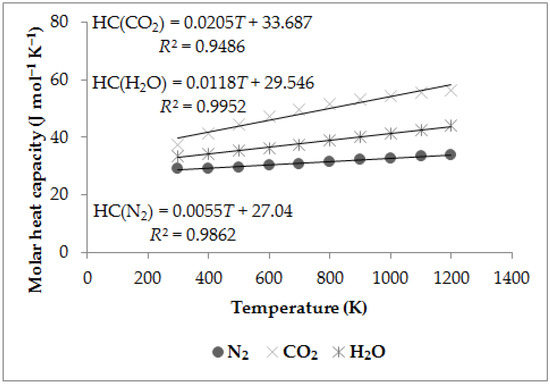 Dependence of molar heat capacity (HC) of nitrogen, carbon dioxide, and water vapor on temperature (T) in the interval from 300 to 1200 K at constant pressure (the figure was derived from data adapted with permission from. Ref. [31]. 2015, Taylor and Francis Group LLC (Books) US).