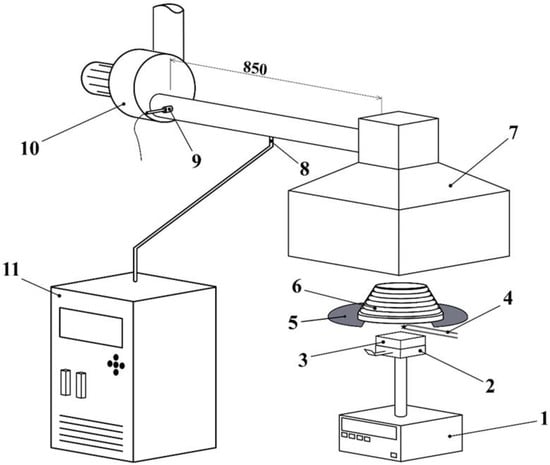 Scheme of the cone calorimeter with marked thermocouple position. 1: Load cell; 2: sample holder; 3: sample; 4: spark igniter; 5: radiation shield; 6: cone heater; 7: hood; 8: combustion products collection point; 9: thermocouple; 10: adjustable fan; 11: combustion products analyzer.