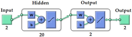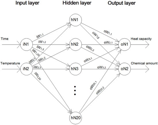 A neural network for prediction of the chemical amount flow rate and molar heat capacity (at constant pressure) has been designed in the MATLAB 2020b software (in the Neural Network Toolbox environment). The structure of the used neural network is shown in Figure 3. The two-layer (hidden layer with twenty sigmoid neurons and an output layer with two linear neurons) feed-forward neural network was used. The Levenberg–Marquardt training algorithm was used. A total of 5415 input data were applied in the training phase, of which 4331 (80%) were used for training and 542 (10%) for both validation and test. The structure of input data for neural network training and data prediction in the trained neural network is shown in Table 2 and Figure 4. A total of 1083 data were used for the additional test.