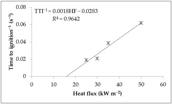The dependence of the inverse value of ignition time on the heat flux is shown in Figure 5. From this dependence, the value of the critical heat flux of the wood species used in the training phase of the neural network was calculated using the method according to [34]. It follows from Figure 5 that wood (used in the training phase of the neural network) shows a critical heat flux of 20.7 kW m−2. It should be noted that the critical heat flux resulting from Figure 5 is only 15.7 kW m−2, but the method according to [34] recommends dividing this value by the 0.76 constant (representing the heat loss).