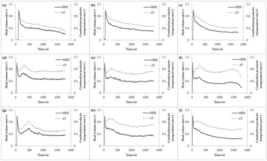 Normalized values (actual value divided by maximum recorded value for each wood and heat flux) of heat release rate (HRR) and combustion products temperature rise (dT) of: (a) locust wood at 25 kW m−2; (b) locust wood at 35 kW m−2; (c) locust wood at 50 kW m−2; (d) poplar wood at 25 kW m−2; (e) poplar wood at 35 kW m−2; (f) poplar wood at 50 kW m−2; (g) willow wood at 25 kW m−2; (h) willow wood at 35 kW m−2; (i) willow wood at 50 kW m−2.