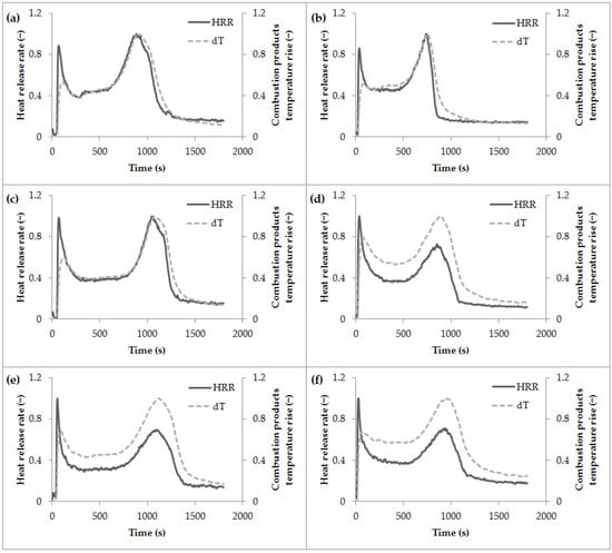 Normalized values (actual value divided by maximum recorded value for each wood and heat flux) of heat release rate (HRR) and combustion products temperature rise (dT) of: (a) birchwood at 30 kW m−2; (b) birchwood at 50 kW m−2; (c) oakwood at 30 kW m−2; (d) oakwood at 50 kW m−2; (e) spruce wood at 30 kW m−2; (f) spruce wood at 50 kW m−2.