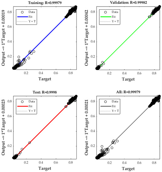The regression of target (true value) vs. output (value predicted by the trained neural network) during the training phase (training phase includes training, validation, and testing) is shown in Figure 8. Figure 8 indicates that the trained neural network can predict with remarkably high accuracy the molar heat capacity and the chemical amount flow rate of wood combustion products in the exhaust duct of the cone calorimeter.