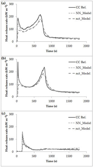 Heat release rate measured by the cone calorimeter as reference method (CC Ref.), computed from heat capacity, substance amount flow rate of combustion products predicted by trained neural network and combustion products temperature rise (NN_Model) and computed by average heat capacity, substance amount flow rate of combustion products and combustion products temperature rise (nct_Model) from: (a) pinewood; (b) iroko wood; and (c) paulownia wood.