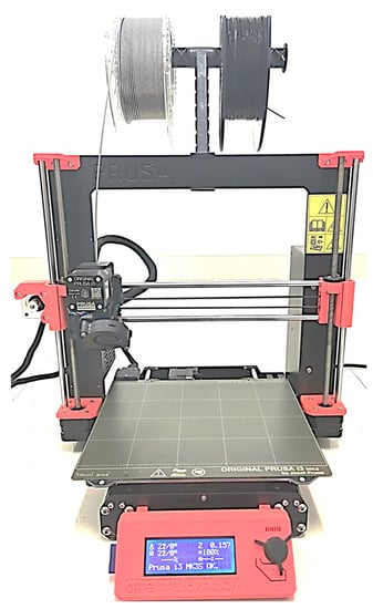 The product was designed using the CREO Parametric 8.0 software in STL format. The STL files of the designed samples were exported from the Creo 8.0 software and imported into Prusa Slicer 2.5.0 for slicing and G-code file generation. An open-access FFF printer (Original Prusa i3 MK3S+) equipped with a 0.4 mm nozzle diameter was used to manufacture the samples. The used printing parameters are listed in Table 1.