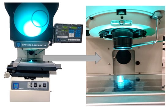 Furthermore, a data collection process was established to measure the three critical quality characteristics (i.e., diameter, height, and wall thickness). The measurement process was conducted using a very precise device called a profile projector, which is shown in Figure 4. The device model is Multi-Lens Profile Projector VOM-2515. According to the manufacture, the error of the contour measuring is under 0.08% under illumination. This measurement device was also examined for its capability to measure the same object various times consistently. Furthermore, the differences between operators were investigated. For this test, ten random parts were chosen to study the capability of the measurement system, where two different operators measured each of these ten parts twice.