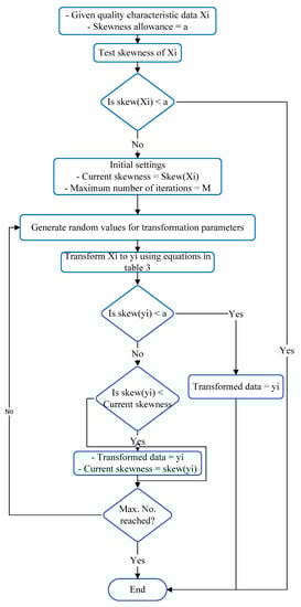 It is worth noting that most statistical tests are based on the assumption of normally distributed data; that is, the conclusion of such tests is valid only if the data fit the normal distribution. The normality assumption can be evaluated through the use of probability plots and histograms. Whenever the data are normally distributed, the measured characteristics may be examined for their correlation directly; otherwise, an appropriate transformation method should be used to transform the data. An improved Johnson transformation method can be used to transform the data to normality; basically, Table 3 was used to transfer the data to follow the normal distribution. However, this transformation does not always perform well. Therefore, another iterative search algorithm was used to continually change the transformation parameters until the data satisfied the normality test. The skewness of the data was used as a measure of the data normality, where normal data have a skewness of zero; a positive skewness indicates that the data are skewed to the right, whereas negative skewness indicates that the data are skewed to the left. The skewness has been used in the literature as an indication of data normality, such as in [40]. Thus, the algorithm presented in Figure 5 was used to search for the optimal parameters for the equations in Table 3, resulting in the minimal skewness of the considered data.