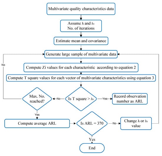 For this reason, an algorithm was constructed that iteratively searches for the optimal values of the MEWMA parameters. The proposed methodology is presented in Figure 6. The algorithm starts by obtaining the multivariate quality characteristic data. These data are then examined for normality, following which the multivariate data are normalized according to the equations provided in Table 3. When the data are normally distributed, the mean and covariance of the considered data are estimated in order to generate large multivariate data based on these parameters. The initial parameters of MEWMA are assigned to the algorithm to compute the corresponding MEWMA values , according to Equation (2). These values are then combined to form a single value for each vector, as in Equation (3). The values of are judged against the upper control limit h4. An initial value for the upper multivariate EWMA chart (h4) is suggested, which is further improved using the proposed MEWMA chart optimization algorithm. For a specific number of iterations, a large sample of multivariate characteristics is generated and evaluated against h4. Whenever an out-of-control signal is found, the corresponding observation number will be registered as an ARL. The process is continued until a preset number of iterations is met, following which the ARL is taken as the average ARL for all iterations. If the ARL is equal to 370, the algorithm is stopped and the optimal MEWMA parameters are obtained; otherwise, an action is taken by changing either or h4. Basically, different runs of the algorithm are performed with different values of h4: each time, a given value of h4 will be fixed, whereas is iteratively changed until ARL = 370 is satisfied.