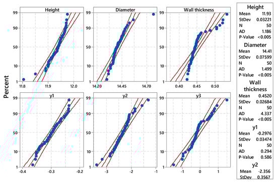 We used the MATLAB software to improve the quality of the transformation of the non-normal data, allowing it to become normally distributed. Consequently, the skewness of the transformed data was dramatically improved by designing an appropriate algorithm based on changing the parameters of the transformation function iteratively and evaluating the corresponding results against the original. Table 7 presents the skewness values for the considered three quality characteristics of the 3D-printed parts (height, ; diameter,; and wall thickness, ), with the skewness values of the same data after transformation by the two considered methods. The table clearly demonstrates the large differences between original and Johnson-/improved Johnson-transformed data in terms of skewness.