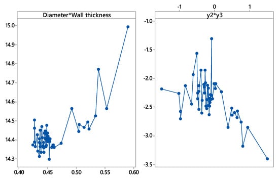 For the above analysis, a Pearson correlation test was conducted. This test requires the relationships between the investigated variables to be linear. Therefore, it is important to validate the linearity assumption. The scatter diagram is ideal for visualizing the type of relationship or judging the existence of a curvilinear relationship between two variables. The two quality characteristics (diameter, wall thickness, and their corresponding transformed data) were plotted in scatter diagrams to investigate the relationships between each pair, as shown in Figure 8 The graph shows a positive trend for diameter and wall thickness data, whereas a negative trend can be observed for the transformed data. Regarding the type of relationship, some constant linear patterns can be observed at the beginning of the data; however, a positive or negative linear pattern can be seen as the data values increase. The interpretation of the existing negative correlation between the transformed data, in contrast to the original data, is attributed to the transformation of each quality characteristic data separately using different parameters, especially when using an iterative search to further improve each type of transformed data.