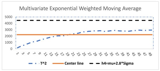 In this study, the multivariate exponential weighted moving average (MEWMA) chart proposed by Lowry, Cynthia A., et al. [42] was used to monitor the variability of the considered process. MEWMA was chosen due to its ability to detect small deviations in the process mean. MEWMA begins by computing a vector for each variable, as shown in Equation (2):