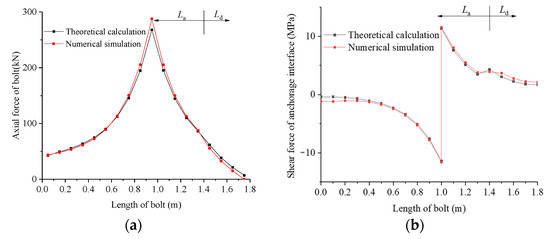 To verify the rationality of the above numerical model, the bed separation value was 2 mm, La was 400 mm, and the prestress was 40 kN. The theoretical calculation and numerical simulation analysis were carried out respectively. The axial force and anchoring interface shear stress of full-length bonded prestressed bolt were compared, as shown in Figure 5. The two blocks of the model had a displacement of 2 mm in the bed separation, which caused the bolt to be stretched to both sides at the separation layer. Therefore, the peak of the bolt axial force at the separation layer was close to 300 kN in Figure 5a. Corresponding to the change in the axial force of the bolt, the shear stress value at the anchorage interface showed an inverse sign on both sides of the bed separation. Therefore, in Figure 5b, the shear stress at the anchorage interface peaked close to 15 MPa on both sides of the bed separation. As can be seen in Figure 5a, the axial force of the bolt on the left side of the separation layer gradually decayed to the initial prestress applied, and the axial force of the bolt on the right side of the separation layer gradually decayed to zero. As can be seen in Figure 5b, the shear stress at the anchorage interface on the left side of the separation layer gradually decayed to zero, while the shear stress at the anchorage interface on the right side of the separation layer first decreased, then increased, and then decreased due to the effect of the initial prestress.