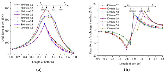 The prestress of the bolt was set to 40 kN, the bed separation value was set to 2 mm and 4 mm, and Ld was set to 400 mm, 600 mm, 800 mm, and 900 mm, respectively. The numerical model test was carried out, and the test results are shown in Figure 6. It can be seen in Figure 6a that when the fracture aperture was 2 mm, the axial force variation in the bolt was consistent, and the bolt did not slip. The axial force of the bolt reached the maximum value at the separation layer, and the maximum value was almost the same. When the fracture opened to 4 mm, the bolts all started to slide, and the “axial force platform” (i.e., the interval with the same axial force) appeared. When the Ld was 400 mm, there were two sliding elements; when Ld was 600 mm, 800 mm, and 900 mm, there were three sliding elements. Due to the increase in the sliding elements, when Ld was 600 mm, 800 mm, and 900 mm, the maximum axial force of the bolt at the bed separation was smaller than that when the Ld was 400 mm. As can be seen in Figure 6b, the shear stress at the anchorage interface reached its peak at the fracture, and the shear stress signs on both sides of the separation layer were the opposite. When the fracture aperture was 2 mm and Ld was 400 mm, the shear stress of the anchorage interface increased first and then decreased on La. When Ld was 600 mm, 800 mm, and 900 mm, the shear stress variation in the anchorage interface was consistent on Ld. When the fracture aperture was 4 mm, the shear stress of the anchorage interface showed a zero interval, corresponding to the “axial force platform” of the bolt.