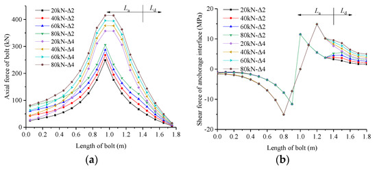 La was set at 400 mm, the bed separation value was set at 2 mm and 4 mm, and the prestress was set at 20 kN, 40 kN, 60 kN, and 80 kN, respectively. The numerical model test was carried out, and the test results are shown in Figure 9. It can be seen from Figure 9a that the axial force of the bolt followed the same change rule under different prestresses, and the maximum value appeared at the separation layer. Under the bed separation, the maximum axial force of the bolt increased with the increase in prestress. It can be seen from Figure 9b that the shear stress at the anchorage interface reached its peak at the separation layer, and the shear stress signs on both sides of the separation layer were the opposite. The larger the bed separation value, the greater the peak value of the shear stress on the anchorage interface. When the fracture aperture was 2 mm, the shear stress curves of the anchorage interface overlapped on Lb. On La, the shear stress of the anchorage interface increased first and then decreased when the prestress was 80 kN and 60 kN, and showed a decreasing trend when the prestress was 40 kN and 20 kN. When the crack was 4 mm wide, the shear stress curves of the anchorage interface overlapped on Lb. On La, the shear stress of the anchorage interface all showed a decreasing trend.
