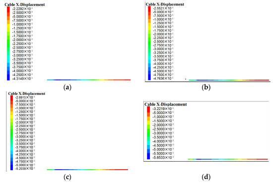Cloud image of the cable displacement under different prestress (with fracture aperture of 4 mm). (a) Prestress = 20 kN; (b) prestress = 40 kN; (c) prestress = 60 kN; (d) prestress = 80 kN.