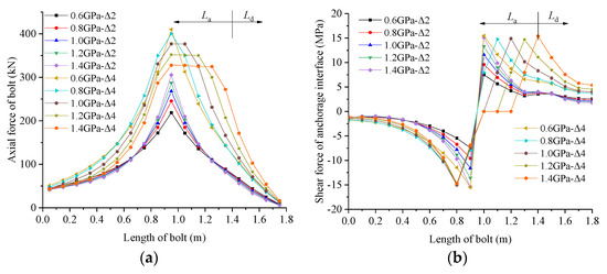 La was set at 400 mm, the prestress was set at 40 kN, the bed separation value was set at 2 mm and 4 mm, and the bond stiffness was set at 0.6 GPa, 0.8 GPa, 1.0 GPa, 1.2 GPa, and 1.4 GPa, respectively. The numerical model test was carried out, and the test results are shown in Figure 12. It can be seen from Figure 12a that when the fracture aperture was 2 mm, the bolt axial force reached its peak value at the separation layer, and the bolt axial force increased with the increase in the bond stiffness, and the overall change law was consistent. When the crack was 4 mm wide and the bond stiffness was 0.6 GPa and 0.8 GPa, there was no sliding failure element in the bolt. The bond stiffness was 1.0 GPa, 1.2 GPa, and 1.4 GPa, and the bolt had 2, 3, and 4 slip failure units, respectively. It can be seen from Figure 12b that the shear stress at the anchorage interface reached its peak at the separation layer, and the values of shear stress on both sides of the separation layer were the opposite. When the bond stiffness was different, the shear stress on the whole bolt kept the same change rule. The peak value of shear stress on the anchorage interface increased with the increase in the bond stiffness. The peak values of shear stress were the same when the bond stiffness was different. The shear stress at the anchorage interface appeared as a zero value interval corresponding to the “axial force platform”, which was consistent with the change law of the axial force.