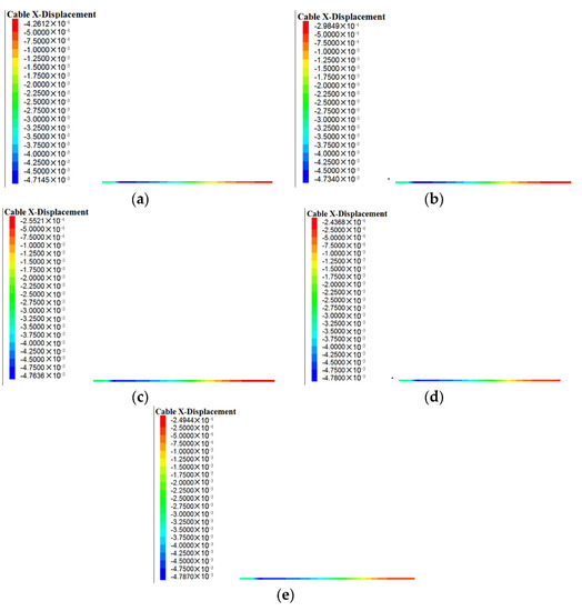 Cloud image of the cable displacement under different bond stiffness (with a fracture aperture of 4 mm). (a) Bond stiffness = 0.6 GPa; (b) bond stiffness = 0.8 GPa; (c) bond stiffness = 1.0 GPa; (d) bond stiffness = 1.2 GPa; (e) bond stiffness = 1.4 GPa.
