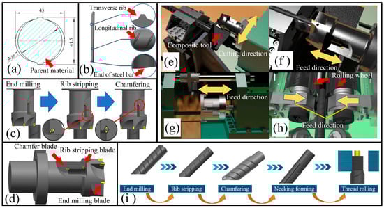 For HRB500 high-strength steel bars, Figure 1 shows the technical process of processing proposed in this paper. Firstly, the composite tool is used to mill the end face of the steel bar. Then, the transverse rib and longitudinal rib of the steel bar are stripped, and chamfer on the end surface is carried out (Figure 1c). Finally, the thread is extruded after the necking process (Figure 1i). The method can effectively improve the connection strength and thread accuracy of the end.