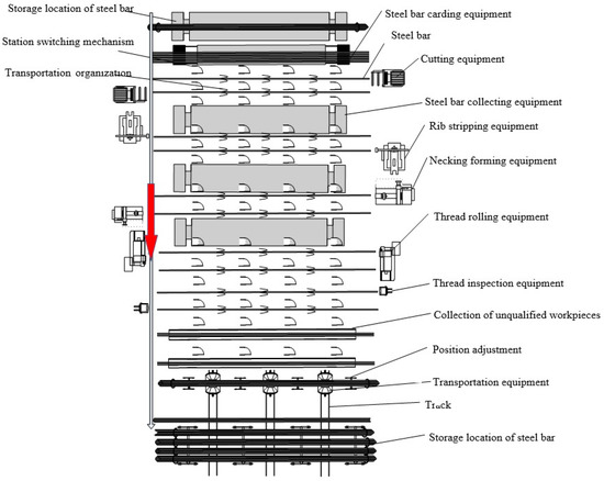 Figure 2 shows layout of the HRB500 high-strength steel bars production line. The axial length of the HRB500 high-strength steel bars is 12 m. They are not suitable to be transported in a curved way. Therefore, a linear arrangement is adopted in this production line. The processing equipment of each station is installed on the left and right sides of the production line.
