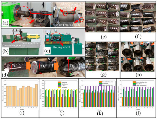 Experimental process. (a) Rib stripping and chamfering equipment. (b) Necking formation machine. (c) Thread rolling machine. (d) Diameter to be measured. (D1—Dimensions of steel bar end after stripping ribs. D2—Dimensions changes after necking formation. D3—Thread outer diameter after rolling.) (e) Experimental results of workpieces by composite cutting tool. (f) Experimental results of workpieces after necking formation. (g) Experimental results of workpieces after thread rolling formation. (h) Experimental results of workpieces for screw-in test. (i) Dimensions of steel bar end after stripping ribs. (j) Dimension changes after necking formation. (k) Changes of pitch diameter of rolled thread. (l) Changes of thread outer diameter after rolling.