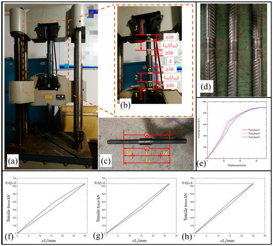 Figure 4b shows the distribution of measuring points for total elongation. To measure the maximum total elongation Asgt and uniaxial tensile residual deformation u0, the steel bar surface is marked before the tensile test and changes in the length of the steel bar can be measured, as shown in Equation (2). Marking on both sides of the connection sleeve at a distance greater than 80 mm, and then marking again in the direction away from the sleeve, the distance between the two marked lines on the same side is greater than 100 mm. For the uniaxial tensile test, the load is loaded in the following way: firstly, from 0, loaded to 0.6 fyk (HRB500 high-strength steel bar with fyk of 500 MPa); then unloaded to 0 and the amount of residual deformation of the steel bar is measured; finally, loaded from 0 to the maximum tensile force.
