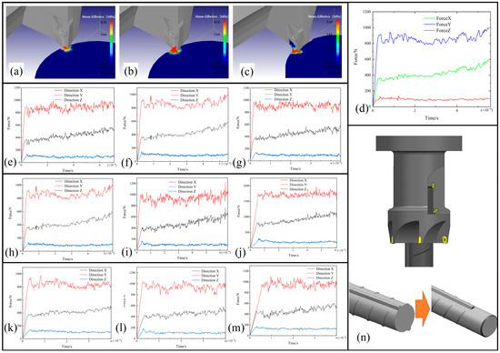 E×ploring the influence of cutting parameters on cutting force. (a–c) Simulation of cutting process: stages of (a) plastic deformation, (b) shear slip, and (c) chip formation. (d) Curve of cutting force variation. (e–g) Cutting force in different directions: the speed of (e) 300 r/min, (f) 400 r/min, and (g) 500 r/min. (h–j) Cutting force in different directions: the feed rate per tooth of (h) 0.12 mm/z, (i) 0.15 mm/z, and (j) 0.18 mm/z. (k–m) Cutting force in the Z direction. The depth of cutting is (k) 2 mm, (l) 3 mm, and (m) 4 mm. (n) Composite tool cutting ribs of surface.
