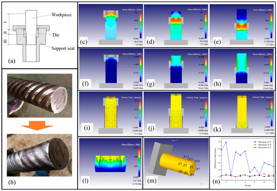 E×ploring the influence of necking formation process on high-strength steel bar processing by finite element analysis (FEA). (a) Diagram of the necking formation process (III—deformed section, II—plastic deformation, I—not deformed). (b) Changes before and after necking formation. (c–e) The equivalent stress distribution: stages of (c) initial extrusion, (d) stable extrusion, and (e) final extrusion. (f–h) Equivalent strain distribution: stages of (f) initial extrusion, (g) stable extrusion, and (h) final extrusion. (i–k) Metal flow velocity distribution: stages of (i) initial extrusion, (j) stable extrusion, and (k) final extrusion. (l) Equivalent stress distribution diagram of the die. (m) Surface point set of extrusion parts. (n) Coordinate difference value before and after springback of workpiece.