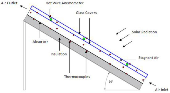 A schematic view of a conventional FPSAH (Case A) is presented in Figure 1. The heart of the FPSAH, which is the absorber, was made of a 1 mm galvanized iron sheet with dimensions of 1000 mm × 2000 mm, which was later painted black. The incoming solar radiation penetrates a 3 mm glass plate with the same dimensions as the absorber, with a distance of 100 mm between them. The air enters the solar air heater at a low temperature, and the absorber then transfers the maximum amount of heat to the airflow so that the outlet temperature reaches its maximum value. To minimize the heat lost to the atmosphere, the absorber bottom wall was insulated with 100 mm of sawdust. The device had a tilt angle of 30°, measured from the horizontal in the city of Shebin El-Kom, Egypt, which is located at 30.56° N and 31.00° E. Similar to Case A, Case B refers to a modified FPSAH using an air gap, as indicated in Figure 2. The gap between the two glass layers was 50 mm, with static air to raise the efficiency of the SAH. All the side walls of the upper glass box were glass with a thickness of 3 mm.
