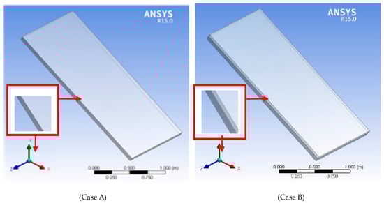 In any problem, the initial step in CFD is the creation of a geometric model. Three-dimensional geometries of Case A and Case B were created using the ANSYS R15.0 Workbench, which provided Design Modeller as a design tool to develop the geometric configurations of the physical problem domain. Figure 4 presents the geometric configurations of both tested SAHs with similar dimensions to the designed experimental configurations, which were imported into the ANSYS meshing module.