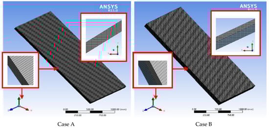 Since the geometries of Case A and Case B did not involve any type of curved surfaces, the CutCell meshing method was extremely well-suited [27,28] and could provide accurate solutions with the moderate computational time required to use the ANSYS MESHING workbench, as shown in Figure 5. The total number of nodes for Case A and Case B in the meshed domain was 218,160 and 366,226, respectively, and the total number of nodes for the elements was 206,400 and 343,600, respectively.