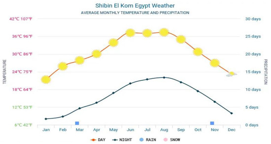 Variations in average values of the minimum and maximum temperatures of the ambient air for Shebin El-Kom city, Egypt during the year.