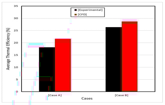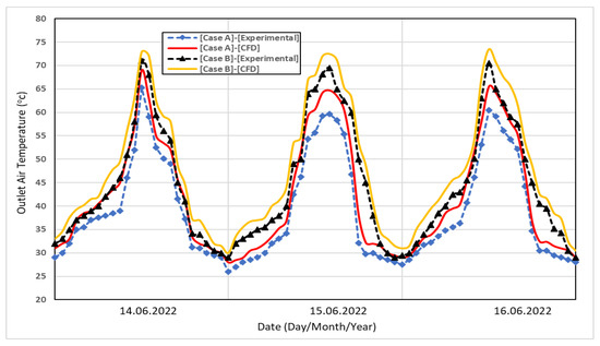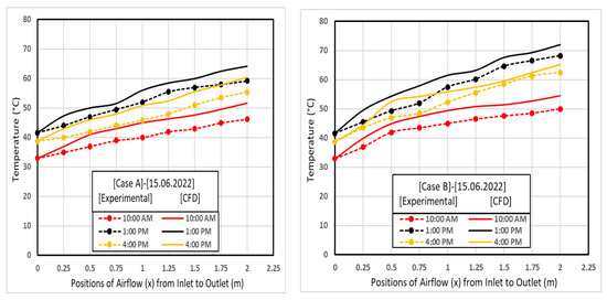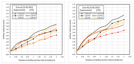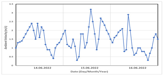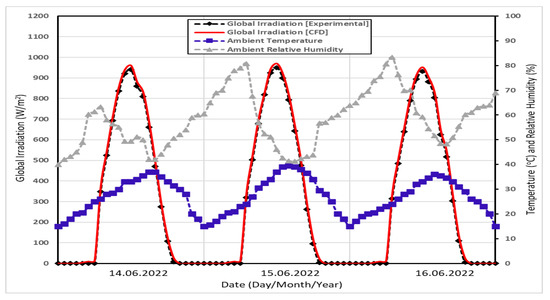 The performance of the flat-plate solar air heaters was influenced directly by the weather conditions, especially the ambient temperature, global irradiance, and wind speed. Figure 6 shows the average values of the minimum and maximum ambient air temperature for Shebin El-Kom city, Egypt during the year. The high values were obtained during the months of June and August. In the year under review, temperatures were low from November to February. However, the global irradiance intensity increased with an increase in temperature from March to October. Thus, it is possible to employ solar air heating in Shebin El-Kom during this period. Therefore, the experimental tests were conducted on sunny days from 14–16 June 2022. Figure 7 shows the hourly variations in the experimental and CFD data for global irradiance as well as the ambient temperature and the ambient relative humidity for the different sunny days tested. It can be seen from Figure 7 that the results indicate a good agreement and similar trends between the CFD-simulated results and measured data for the intensity of the solar global irradiance all over the tested days (with maximum amounts of discrepancy of 7%). It can also be noted that the CFD-simulated and experimental global irradiance increased gradually through the local daytime and reached peak values at 12:00, after which they decreased according to the weather conditions. In addition, the variations in the ambient air temperature during the day ranged between 18 °C at night and 38 °C during the day. Figure 8 shows the variations in the ambient air velocity throughout the daytime period of the tested sunny days; the ambient velocities fluctuated between increment and decrement. According to Figure 8, the minimum and maximum ambient velocity during the tested days ranged between 0.25 and 3.2 m/s, respectively.