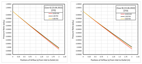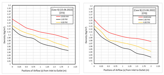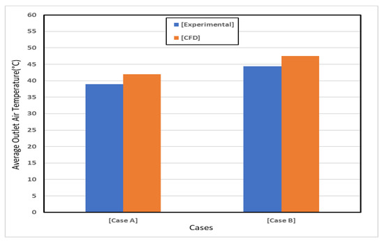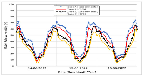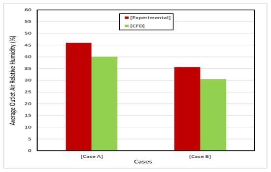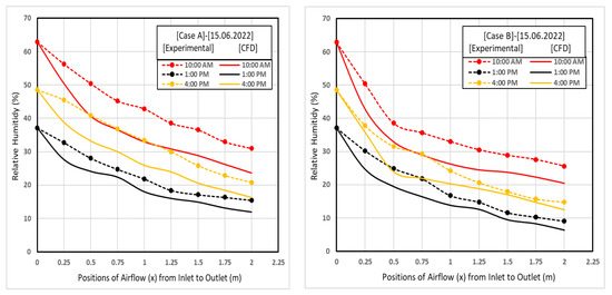 - Comparing Case B to Case A, the CFD simulation showed a 31.6% reduction in the average relative humidity, while the experimental data exhibited a 28.8% reduction in the relative humidity for Case B compared to the reference case.