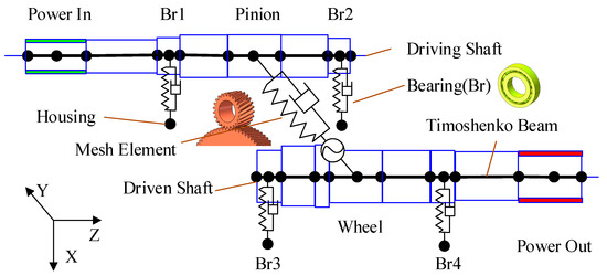 A single-stage helical geared transmission system is used in this study, and the dynamic model is shown in Figure 2.