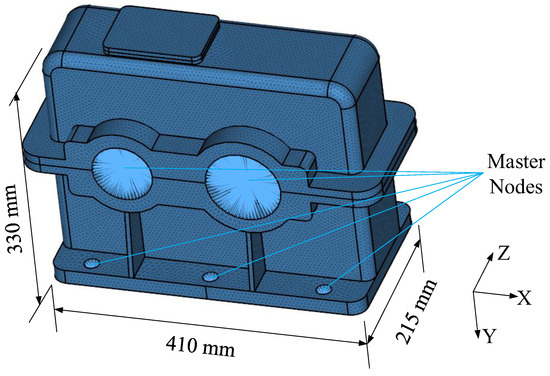 The housing in this research measures 410 mm in length, 215 mm in width, and 330 mm in height. The material is S355B (according to ISO 630-2), which has a density of 7850 kg/m3, a Young’s modulus of 2.07 × 1011 Pa, a Poisson’s ratio of 0.3, and a damping ratio of 2%.