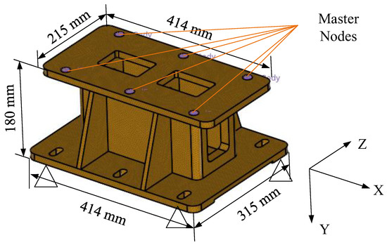 The foundation is 414 mm long, 180 mm high, 215 mm wide at the top, and 315 mm wide at the bottom. The material is AlMg1SiCu (ISO 209.1) with a density of 2700 kg/m3, Young’s modulus of 7 × 1010 Pa, Poisson’s ratio of 0.33, and a damping ratio of 2%. Figure 4 depicts the construction of a foundation FE model using a 4-node tetrahedral element. The element is 5 mm in dimension. About 61,000 nodes and 265,000 elements make up the FE model. Six bolt holes on the top surface are coupled to each center node, which are defined as the master nodes and are meshed with mass elements. The bottom area is fixed, and the first 500 modes are acquired. The mobility matrix Y has a dimension of 3636 since the model comprises six master nodes, each of which provides six-DOF.