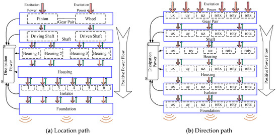 The transfer path of the gear system is the gear-shaft-bearing-housing-isolator-foundation in the whole. The transfer process of each layer can be divided into location transfer path and direction transfer path according to the location and direction of vibration transferring, as is described in Figure 6. The layering location transfer path is shown in Figure 6a. The gear excitation power can be divided into pinion excitation power and wheel excitation power, which are transmitted to the driving shaft and the driven shaft, respectively, through the pinion and wheel; the driving shaft transfers the vibration to the bearings 1 and 2, and the driven shaft transfers to the bearings 3 and 4; each bearing transfers the vibration to the housing; and the housing transmits the vibration to the ship foundation through six vibration isolators. The layering direction transfer path is shown in Figure 6b. Excitation power of gears includes six DOFs. The other subsystems include six DOFs, except bearing without torsional DOFs. The vibration energy transfer paths between subsystems can be regarded as virtual paths composed of six directions.