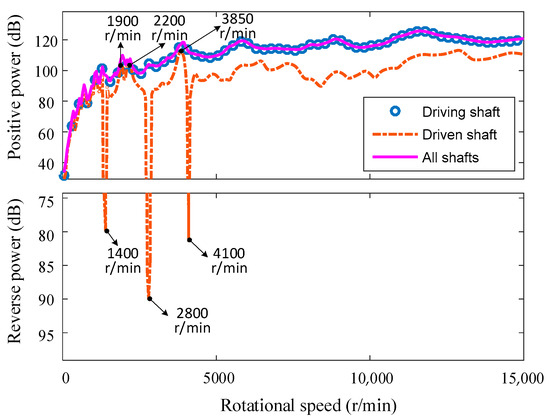 Equations (25) and (27) are used to calculate the transmitted power of gears to shafts in each location path. The transmitted power of the location path corresponding to the gear shaft is shown in Figure 9. It can be seen that most of the vibration power of the gears is transmitted to the driving shaft. The driven shaft receives certain vibration power only at some special resonance speed, such as 1900 r/min, 2200 r/min, and 3850 r/min. The average power of the driving shaft in the whole speed range is 111.3 dB, which is close to the total vibration power of 111.8 dB. Around 1400 r/min, 2800 r/min, and 4100 r/min, there is obvious reverse power in the driven shaft. The amplitude is 79.9 dB, 90.1 dB, and 81.5 dB, respectively. However, compared with the overall 96.9 dB, 104.0 dB, and 112.3 dB, the reverse power flow is too small and can be neglected.