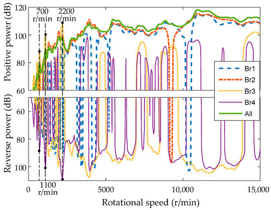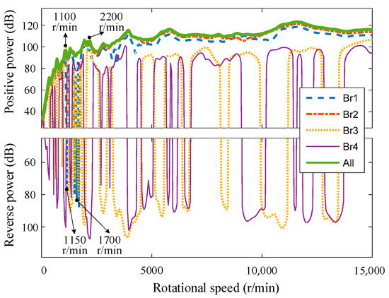 Figure 11 shows the shaft bearing transmitted power corresponding to the location path. Over 5000 r/min in the high-speed range, the bearing 1 and 2 at the driving shaft receive the majority of the shaft’s vibration. The average vibration is 109.7 dB and 112.5 dB, respectively. The combined vibration of bearing 1 and 2 is 114.4 dB, which is close to the total power of 114.5 dB. Bearings 1, 2, and 3 all contribute greatly in the low-speed range below 5000 r/min. There are resonance peaks in the vibration of bearing 3 near 1100 r/min and 2200 r/min, and the amplitude is 4.2 dB and 3.8 dB larger than the total vibration. Bearing 4 has little contribution to vibration transferring in the whole speed range, which can be neglected. The total vibration power of all bearings is a constant positive in the whole speed range, and the vibration power received by bearing 2 in the whole speed range is also a positive power. Bearing 1 has reverse power near 1150 r/min, 1500 r/min, 1600 r/min, and 1700 r/min. Bearing 3 and 4 may have reverse power in the whole speed range.