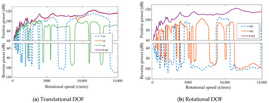 Excitation power of each direction of the gear pair is shown in Figure 8a,b. The gear excitation power is mainly in torsion DOF rotz and vertical DOF uy (rotz DOF means the rotational DOF about z-axis, and uy DOF means the translational DOF along the y-axis). Between 5000 and 15,000 r/min, the power in rotz and uy directions is positive, and the average vibration power is 119.9 dB and 117.3 dB, respectively. The superposition of them is 121.9 dB, which is close to the total 122.1 dB. While, under 5000 r/min, almost all the uy directions are reverse power. The amplitude of the rotz directions is 118.5 dB, 120.3 dB, and 126.2 dB, respectively, near the resonance rotational speeds of 1950 r/min, 2200 r/min, and 3900 r/min. At this time, the uy direction has a large reverse power flow, with the amplitudes of 117.3 dB, 120.1 dB, and 124.6 dB, respectively, resulting in a reduction in the overall vibration power by 7.6 dB, 11.3 dB, and 5.6 dB, compared with the rotz direction. There is also obvious reverse power in the direction of uz at some rotating speed below 5000 r/min. There is reverse power in ux at low and high rotating speed, and there is obvious reverse power in rotx and roty at specific rotating speeds in the whole rotating speed range. The power flow of rotz and the whole system is constant positive power flow in the whole rotating speed range.