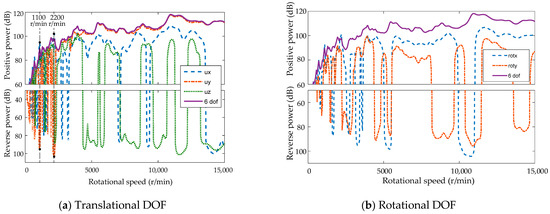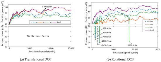 The transmitted power corresponding to the direction path is shown in Figure 16. The direction of power in ux, uy, uz, and roty DOF are constantly positive. There are reverse power flows in rotx and rotz directions at very few rotational speeds. On the whole, the vibration power of the isolator is mainly in the vertical direction uy, and ux and uz also contribute to a certain extent at low speed. Ux has a resonance peak near 8400 r/min with an amplitude of 87.8 dB, which is 5.0 dB higher than the power of uy. Rotx has reverse power near 800 r/min and 1450 r/min, and rotz has reverse power near 600 r/min, 900 r/min, 1800 r/min, and 8500 r/min. However, these reverse powers are too small compared with the total power, and can be ignored.
