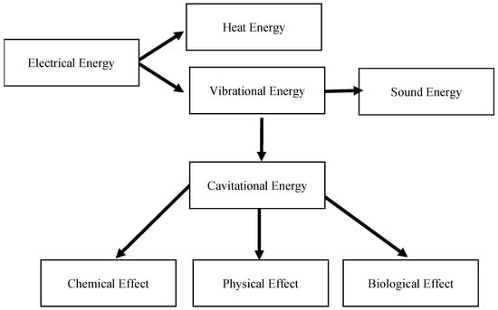 Ultrasound is a type of mechanically oscillating sound wave that can be sustained by an elastic medium, such as air or water. Its frequency ranges from 20 kHz to 10 MHz, which is higher than the limit of human auditory perception (i.e., between 16 Hz and 20 kHz) [1]. According to Chuah et al. [2], ultrasound can be classified into two categories based on its frequency: high-frequency ultrasound (HFU), which has a frequency range of 1000–10,000 kHz, and low-frequency ultrasound (LFU), which has a frequency range of 20–100 kHz. While HFU is more commonly used in medical applications, its use in non-medical fields has been increasing due to its unique characteristics and mechanisms. The application of ultrasound technology has extended to different fields, such as carbon dioxide (CO2) absorption [3,4,5], chemical synthesis [6], wastewater treatment [6,7], medical imaging [8], algae biomass disruption [9], biodiesel production [10], and the food industry [11,12].