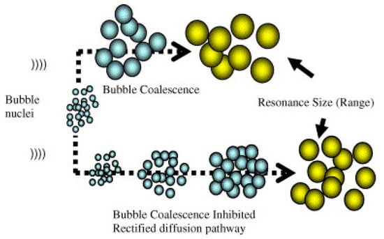 Schematic illustration of bubble nuclei growth in water through a pathway of rectified diffusion and coalescence under the influence of an ultrasonic field (adapted from Ashokkumar et al. [23] with permission from the publisher).