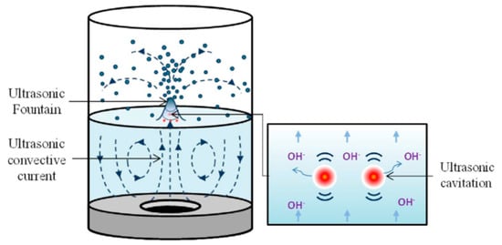 The frequency and cavitation intensity of ultrasound are inversely proportional to each other, as the formation of cavitation bubbles becomes more difficult with shorter rarefaction phases at higher frequencies [1]. At higher ultrasonic frequencies (>1 MHz), jet-like fountain formation and ultrasonic streaming force are enhanced [24]. Shokrollahi et al. [5] found that the fountain formation created under high-frequency ultrasound contributes to the enhancement of mass transfer process. Table 1 summarizes the differences between low-frequency ultrasound and high-frequency ultrasound, while Figure 3 shows the schematic drawing of the behavior of liquid under high-frequency ultrasound conditions.