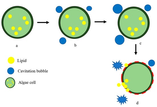 Microalgae, which are photosynthetic microorganisms that require minimal growth requirements, are considered a promising source of lipids, proteins, and carbohydrates. They can produce large quantities of bioproducts in a short time and, thus, are an ideal feedstock for biodiesel production. Microalgae are environmentally and economically advantageous due to their high growth rate and biomass productivity, and their ability to accumulate bioproducts, such as carbohydrates and lipids, under nutrient-limited conditions [71]. Unlike crops, which require growing cycles ranging from three months to three years [72], microalgae have a short growth cycle, and bioproducts such as lipids can be harvested in just 3–5 days. Once the microalgae biomass is cultivated, harvesting and dewatering are carried out, followed by lipid extraction from microalgae [73]. The use of ultrasound pre-treatment is known to increase the lipid yield from the microalgal biomass, as it aids in the disruption of biomass for lipid extraction [74]. Ultrasonic irradiation breaks down the microalgal cell wall and reduces microalgal particle size, leading to a better release of chemical content, thus enhancing extraction efficiency [75]. Figure 5 illustrates the use of HFU technology to aid microalgal cell lysis.