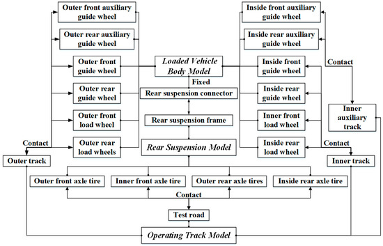 The contact relationship among the three sub-models mainly includes the wheel/track contact of each wheel installed on the loaded vehicle body sub-model with the inner and outer tracks of the operating track model and the tire/road contact between the tires of the rear suspension sub-model and the road surface of the operating track sub-model. The contact relationship of the sub-model is shown in Figure 2.